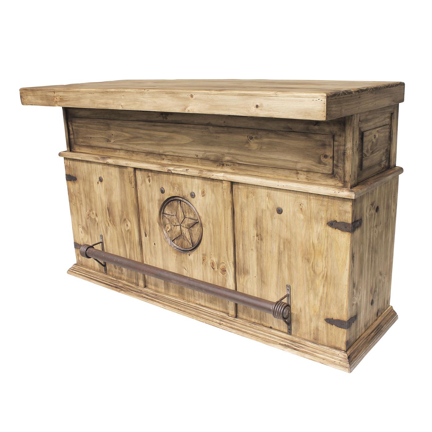You don't have to have a belly to "belly up" to this attractive Cantina Star Bar. Wine racks, shelves, drawers and a cabinet give you all the space you need to store your drink mixing products. Skillfully made by hand in Mexico, the solid pine has a rustic distressed finish that is durable. The southwestern style of the Cantina Star Bar compliments many other furniture designs and even includes an iron foot rest.